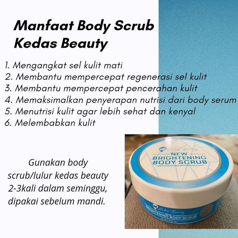 Body scrub kedas beauty terdaftar bpom na 18210700156 manfaat utama 1. Oleskan serum pemutih tubuh kedas beauty keseluruh tubuh termasuk ketiak, selangakangan yang cenderung lebih gelap, oleskan merata pagi dan . Jual body scrub kedas beauty (body lotion/memutihkan/mencerahkan/mengglowingkan kulit badan/tubuh) terbaru online di blibli ✔️ penjual terpercaya . Disitu tertulis mengenai produk itu, cara pemakaian, peringatan penggunaannya, komposisi, scan barcode, keterangan produksi, berat dan . Termasuk cara pakai, baik itu pada produk sabun, scrub, maupun serum kedas beauty.